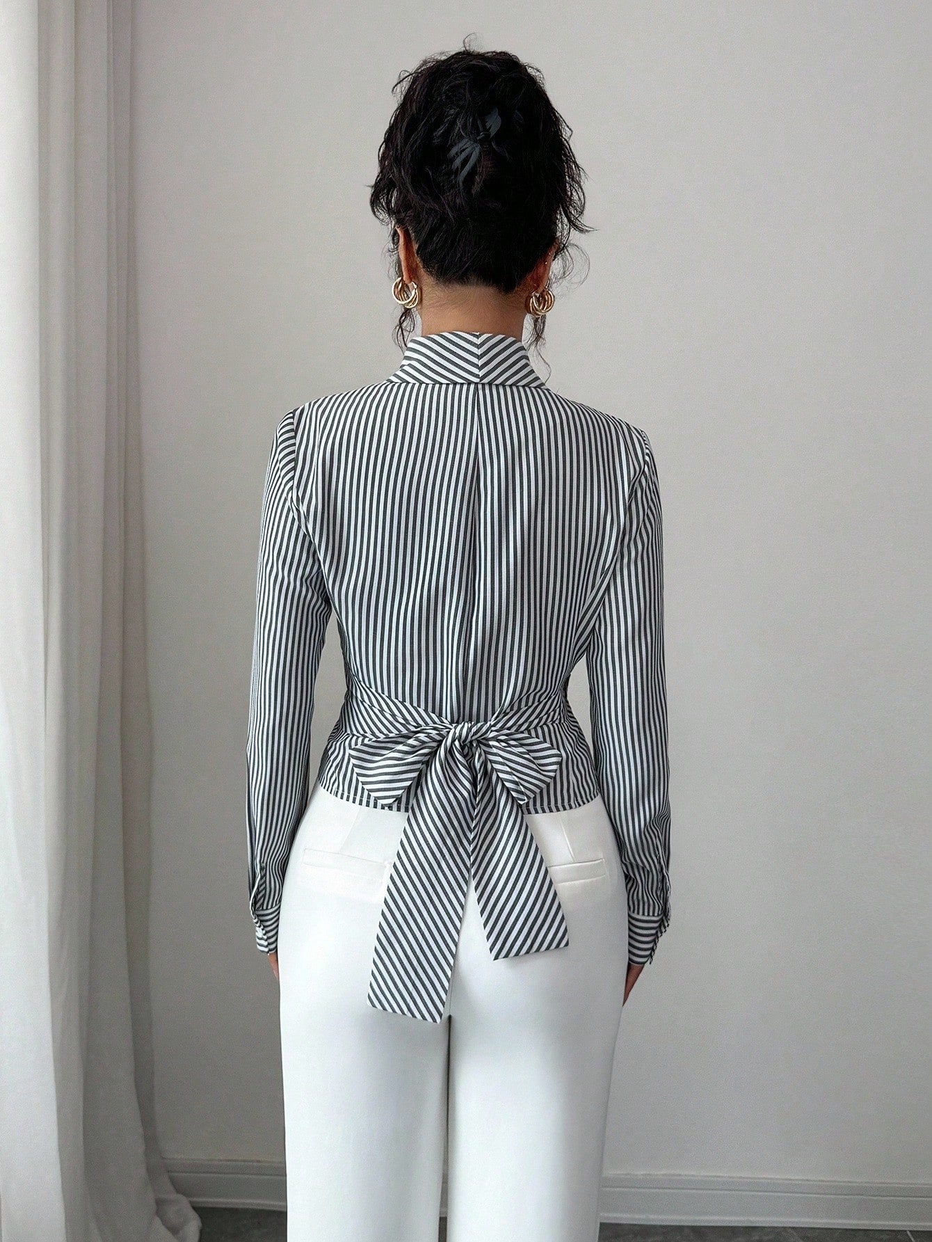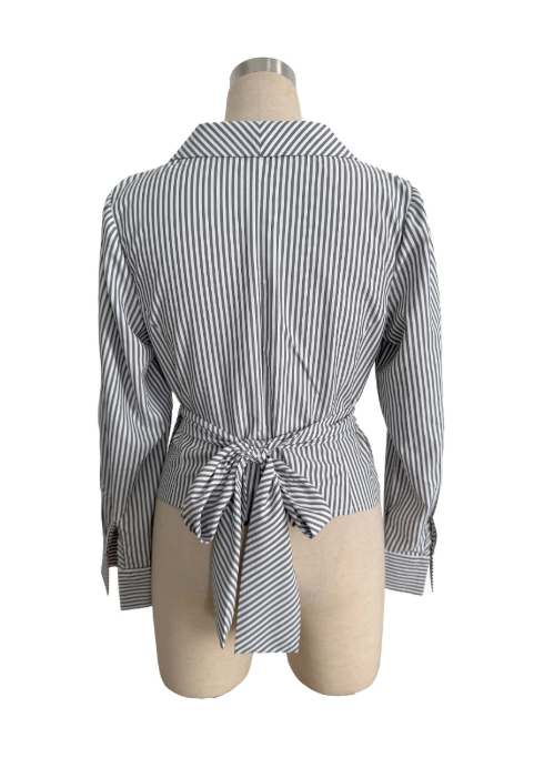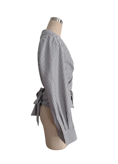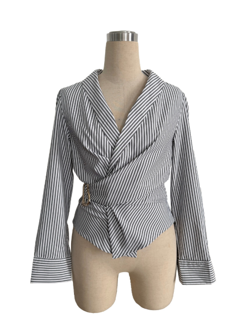 Stand out with this unique asymmetric striped blouse. The irregular design and special metal buttons create a sophisticated, modern look for any occasion.