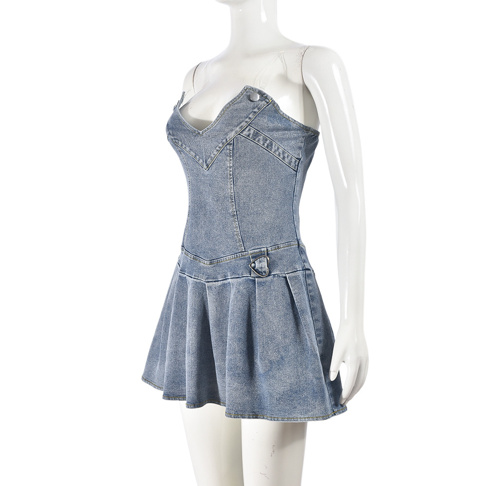 Shop the Elastic Denim French Pleated V-Neck Dress for effortless style and comfort. Made from soft, stretchy denim, this dress features elegant pleats and a flattering V-neckline, perfect for casual outings or chic everyday wear. Available now—elevate your wardrobe with timeless denim fashion!